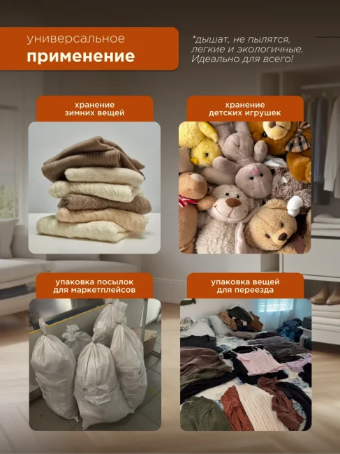 Когда нужна надежная и дышащая упаковка, идеальным решением станут наши тряпичные мешки. Они заменят множество коробок и пакетов, обеспечивая вашим вещам максимальную защиту и сохранность. Такие тряпичные мешки широко применяются для хранения сезонных вещей: одежды, обуви, текстиля и детских игрушек. Мешки для переезда обеспечивают безопасную упаковку различных предметов, книг и спортивного инвентаря. Наши мешки для фасовки товаров на маркетплейсах - это надежное решение для упаковки одежды, обуви и мягких игрушек, они защитят ваш товар от пыли и влаги во время доставки. Они также подходят для хранения в любом пространстве идеально подходят для организации порядка на балконах, в гардеробных и кладовых.
