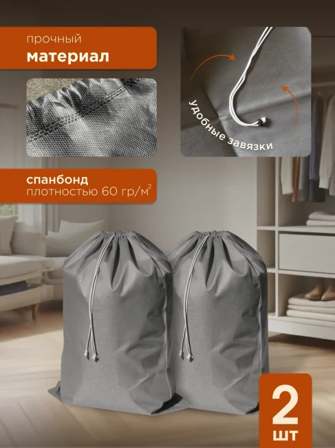 Большие мешки из спанбонда 120х150 см (упаковка 2 шт.) изготовлены из прочного дышащего материала (60 г/м²), что делает их идеальными для хранения вещей, упаковки игрушек, организации переезда и фасовки посылок для маркетплейсов. Размер мешков составляет 120*150 см. Благодаря структуре материала мешки для дома устойчивы к разрывам, деформации и пропускают воздух, предотвращая образование влаги и плесени.