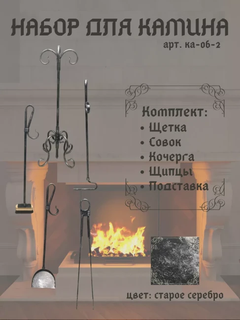 Набор для камина станет не только полезным аксессуаром к Вашему камину, но ещё и отличным решением для дополнения интерьера. В набор входят: щётка, совок, кочерга, щипцы и подставка. Материал: металл. Цвет: старое серебро.