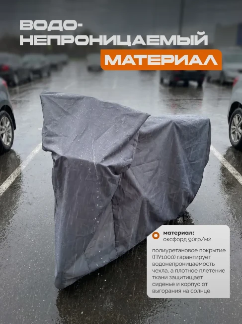 Для сохранения внешнего вида вашего транспорта этот чехол для велосипеда электро станет лучшим помощником. Изделие изготовлено из прочного материала Oxford 210 PU1000 плотностью 90 г/м². Материал чехла имеет высокие водоотталкивающие свойства (выдерживает давление водяного столба до 1000 мм), а плотное плетение ткани защищает сиденье и корпус от выгорания на солнце. Это отличный водонепроницаемый чехол для велосипеда на шнуре с фиксатором, так как шнурок по низу позволяет надежно зафиксировать изделие даже в ветреную погоду.